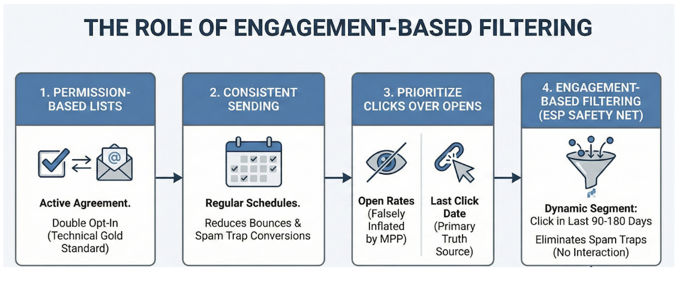 This is where engagement-based filtering becomes your safety net. Unlike real humans, spam traps (especially pristine ones) are scripts. They do not interact with content. They don't browse websites, and they rarely click links. By configuring your ESP to send primary campaigns only to a dynamic segment of users who have clicked a link in the last 90 to 180 days, you statistically eliminate the vast majority of potential traps.